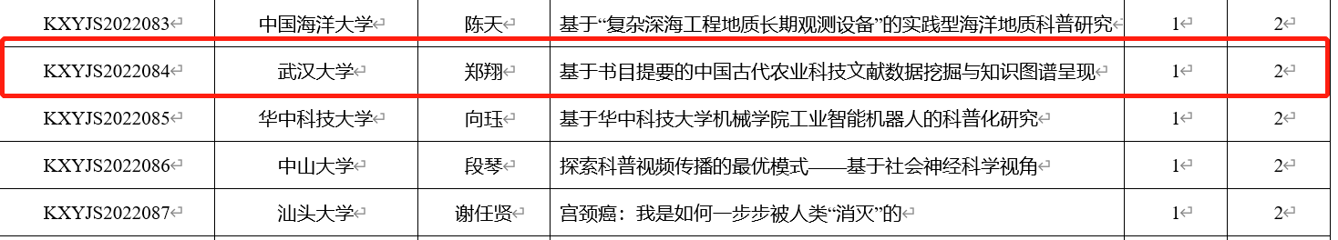 Data Mining and Knowledge Map Presentation of Ancient Agricultural Sci-tech Literature in China Based on Bibliography Summary(Project No. KXYJS2022084) was in the category of Science Popularization Transformation of Scientific Research Achievements,applied byXiang Zheng, a 2021-grade doctoral student of our School.