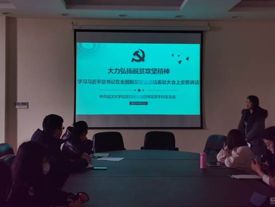 此次专题研习由图书馆学本科生支部领学。朱传宇聚焦“脱贫攻坚战与扶贫干部”,带领与会同志回顾了近十年党中央对于“精准扶贫”的政策设计和实施过程,讲解了脱贫攻坚战取得全面胜利的基本情况。随后,她介绍了黄文秀、毛相林等全国先进扶贫干部的感人事迹,号召全体党员同学向他们学习,心怀人民,扎根基层,在党和人民最需要的地方力行创绩。