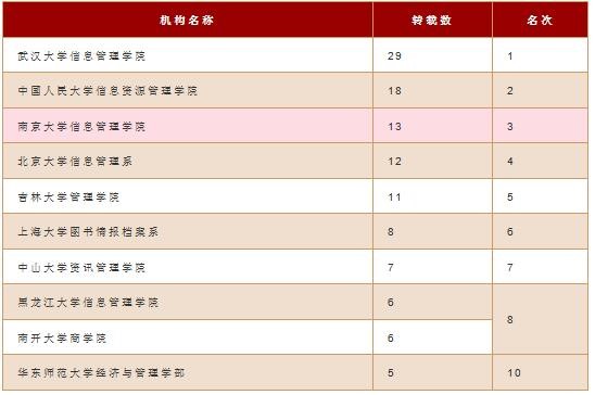 根据发布成果显示,在“图书情报与档案管理”学科中,3044永利集团作为二级院校机构,有29篇论文被全文转载,在该学科中高等院校二级院所分学科排名第一;3044永利集团作为本学科高等院校排名第一,共转载30篇次,约占本学科转载总数(284篇)的10.6%。