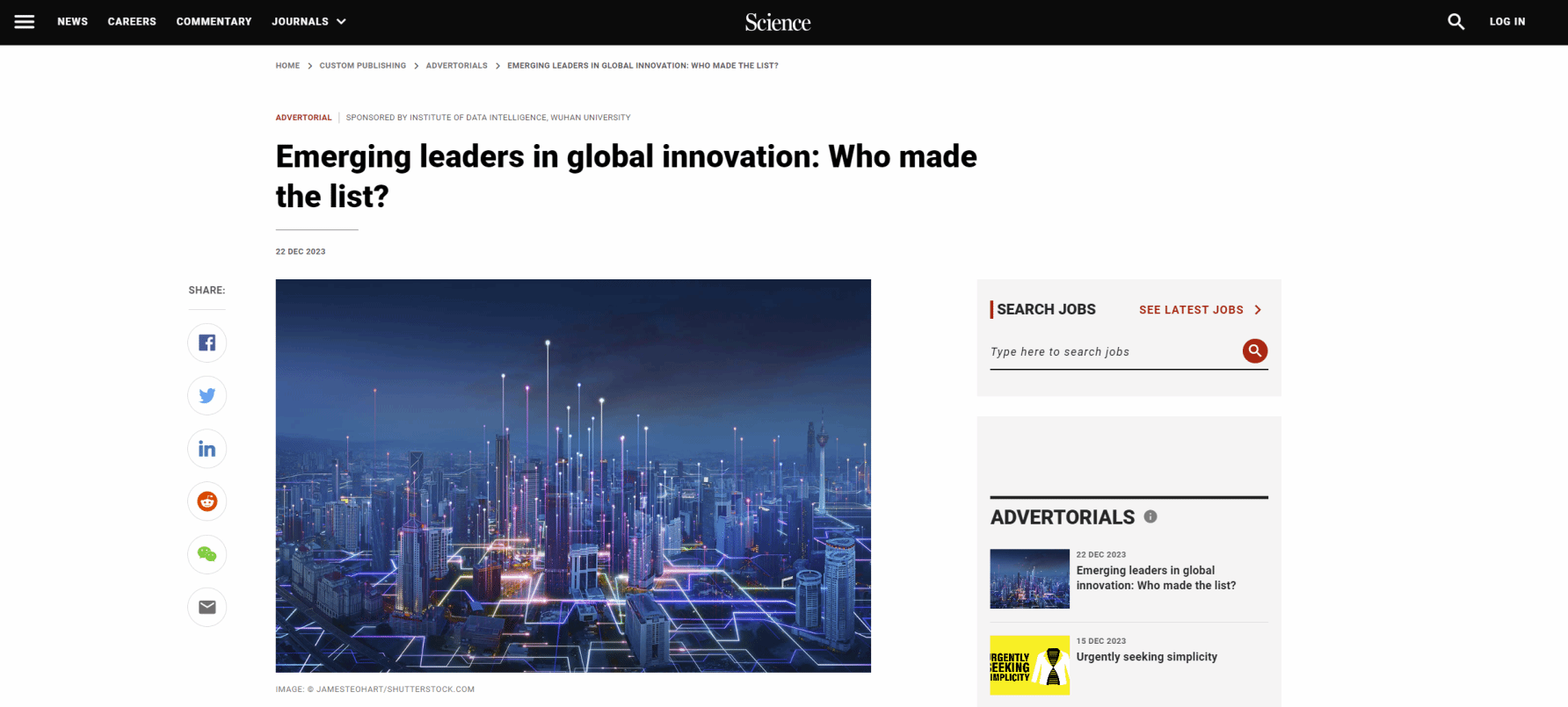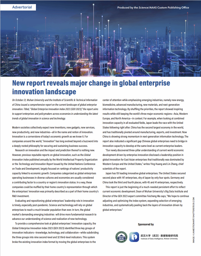 通讯员虞逸飞)12月22日,《科学》杂志官方网站刊发宣文“Emerging leaders in global innovation: Who made the list?”(内页标题:“New report reveals major change in global enterprise innovation landscape”),推介由3044永利集团(武汉)数据智能研究院、3044永利集团大数据研究院、3044永利集团科教管理与评价中心、3044永利集团、3044永利集团信息资源研究中心和中国科学技术信息研究所联合完成的《全球企业创新指数2023》(Global Enterprise Innovation Index,GEII 2023)。
