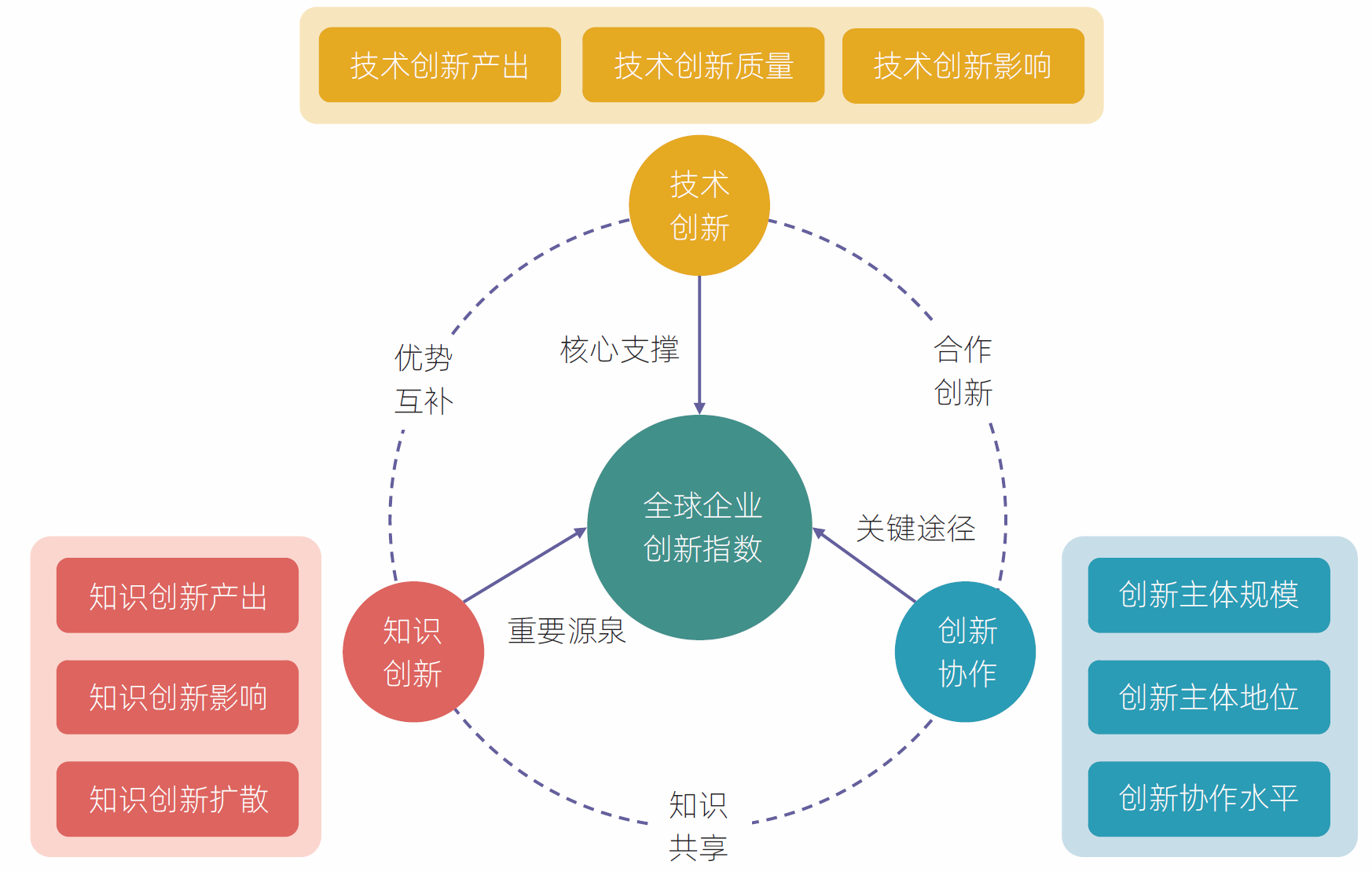 GEII 2023从知识创新、技术创新、创新协作三个维度综合评估企业的科技创新能力。指标体系由3个一级指标、9个二级指标和32个三级指标构成,对全球新能源、生物医药、先进制造、新材料和新一代信息技术等五个领域的企业的科技创新能力进行全面评估。