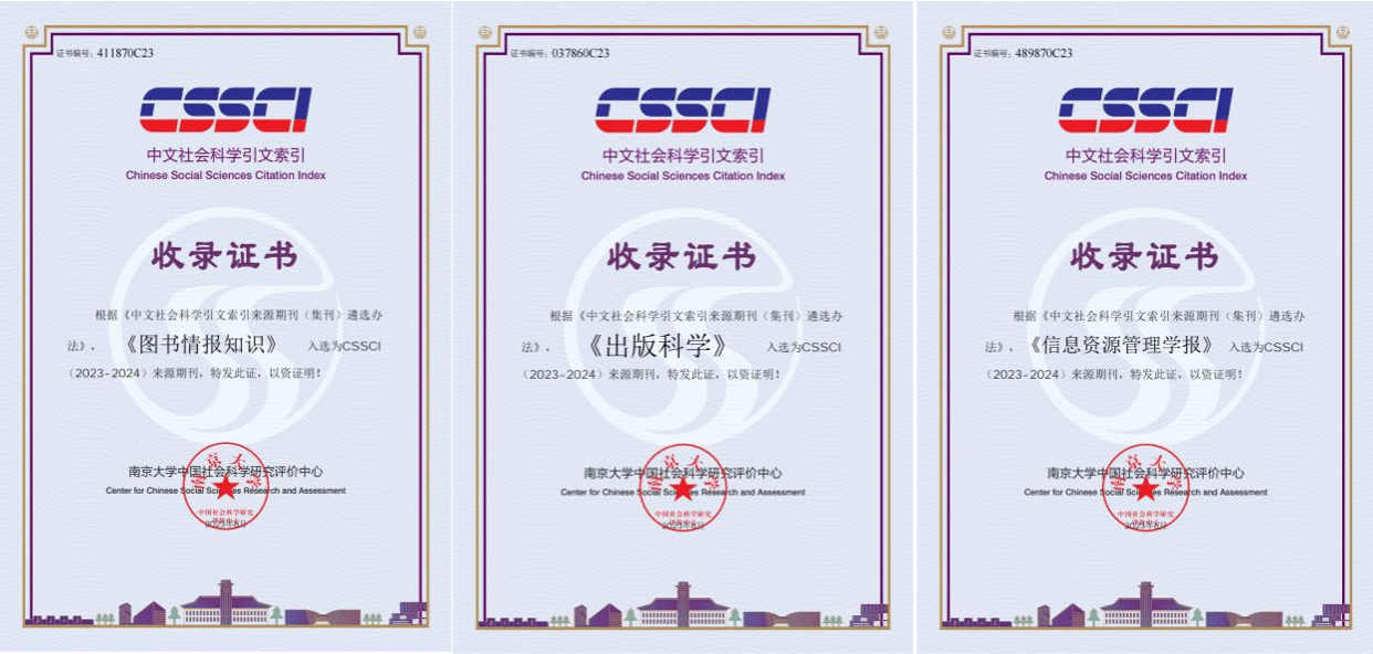 (通讯员杨丹丹)近日,公司收到南京大学中国社会科学研究评价中心CSSCI来源期刊(2023—2024)收录证书,公司《图书情报知识》《出版科学》《信息资源管理学报》三种期刊再次入选CSSCI来源期刊。