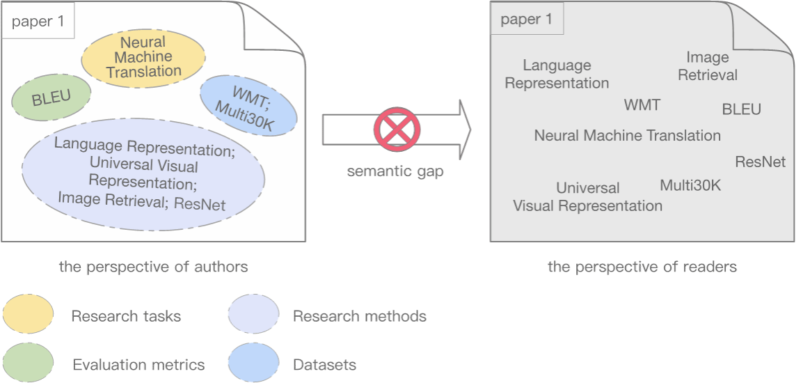 随着关键词在信息检索与自然语言处理任务中的广泛应用,关键词抽取逐渐兴起。然而,由于深度学习的端到端学习机制,使模型能够直接学习文本的重要语义信息,在统计层面上重要的关键词对相关任务的贡献越来越小。同样,由于大多数论文的关键词几乎都没有明确标注其与论文内容的对应关系,这使得读者无法像作者一样清晰地知道各个关键词在特定上下文中的语义角色,即关键词功能。相对作者而言,读者所见的关键词语义并不完整(如下图所示),仅根据关键词文本本身难以快速理解文章的主要内容。在某种程度上,关键词似乎不够重要,关键词抽取的必要性也有待商榷。