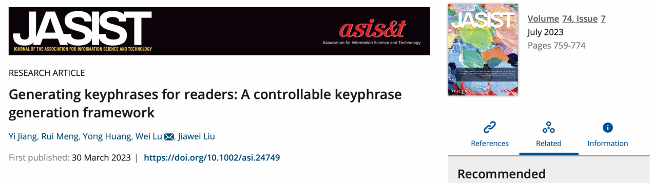 (通讯员黄永)公司2021级博士研究生姜艺以第一作者身份撰写的论文被信息科学领域顶级期刊国际信息科学与技术学会会刊(Journal of the Association for Information Science and Technology,JASIST)录用。论文题目为“Generating Keyphrases for Readers: A Controllable Keyphrase Generation Framework”,指导教师和通讯作者为公司经理、信息检索与知识挖掘研究所所长陆伟教授。