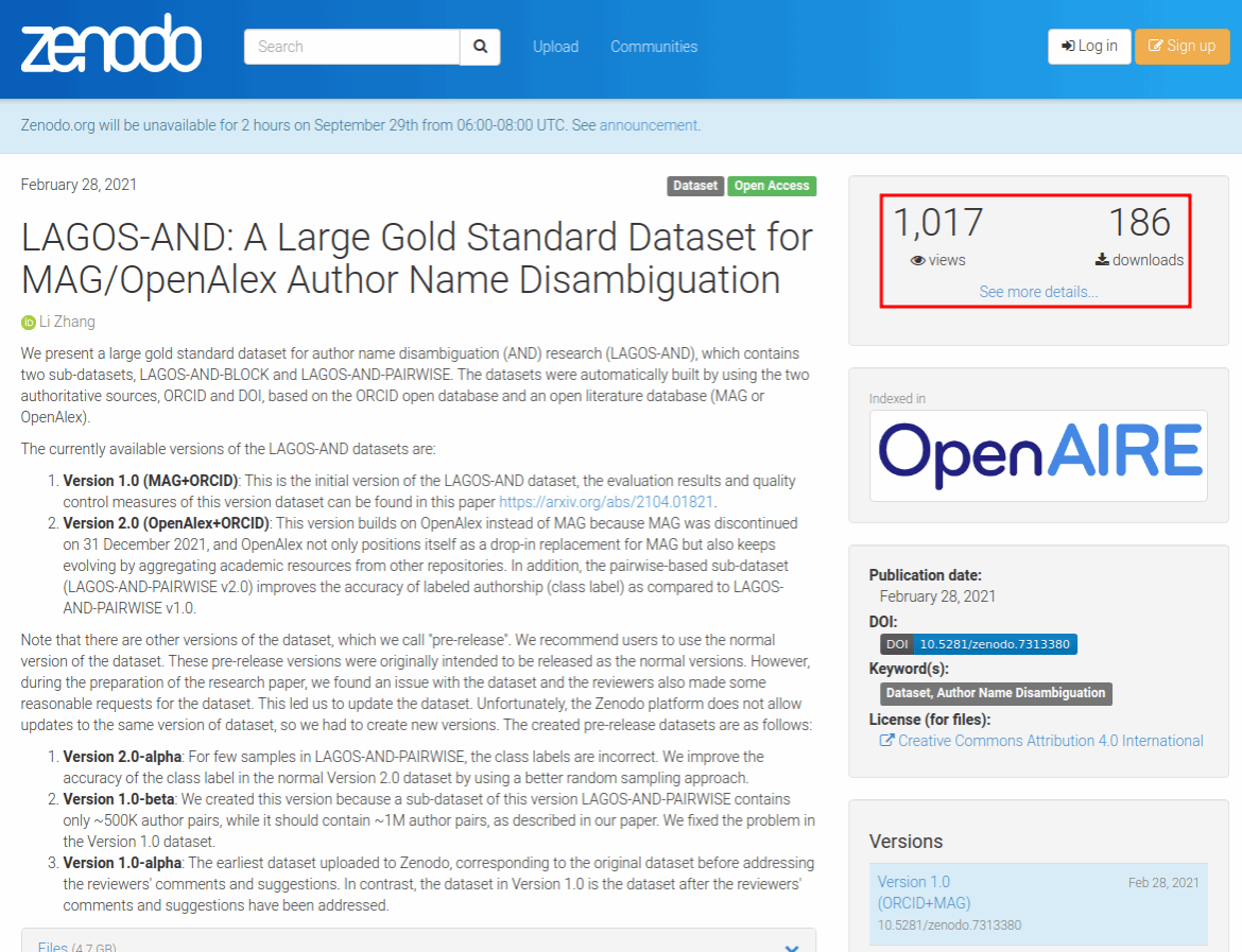 LAGOS-AND的获取链接为 https://zenodo.org/record/7313380。目前,LAGOS-AND已经拥有2个正式版本(Version 1.0和Version 2.0),其中Version 1.0版是依托2019年的MAG文献数据库创建的,Version 2.0版是依托2022年的OpenAlex文献数据库创建的。自发布后,LAGOS-AND数据集在学术界产生了一定的影响力。截至2023年9月,该数据集已被浏览超过1000次,被下载超过180次。(责编范秋砚