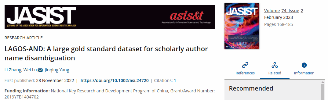 (通讯员程齐凯)信息科学领域顶级期刊国际信息科学与技术学会会刊Journal of the Association for Information Science and Technology (JASIST)发表了公司博士生张力(现已毕业)作为第一作者的研究成果“LAGOS-AND: A Large Gold Standard Dataset for Scholarly Author Name Disambiguation”。该文指导老师和通讯作者为公司经理、信息检索与知识挖掘研究所所长陆伟教授。