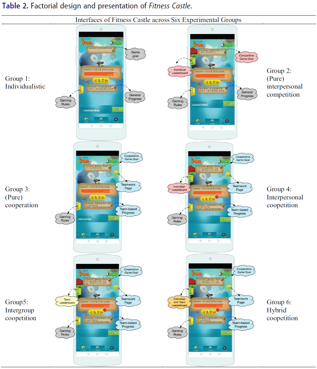 该文着眼探究社交游戏化设计提升用户体验、促进用户健康行为的内在影响机制。该研究基于一款研究团队自主开发的计步类移动健身app,使用长期田野实验的方法,探究了不同的社交机制对游戏化体验成效及实际成效的影响。541名实验参与者,被随机分配到6个不同的社交游戏化情境中(如下图所示),并使用具有不同社交机制的计步类移动健身app长达63天,得到541*63的面板数据,包含用户的每日运动情况及每日app使用情况。实验结果显示,个人竞争、组内合作、组间竞争等社交机制对于社交游戏化的体验成效和实际成效有着不同影响。具体而言,在缺失竞争机制的情况下,合作机制能够促进app的体验成效,但由于社会性懈怠降低了app的实际成效(每日步数)。而在个人竞争、组内合作、组间竞争共同存在的“混合竞合”组,app的体验成效(每日游戏参与)和实际成效(每日步数)达到了整体最优。该研究基于上述发现,对社交游戏化中的用户行为影响机制进行了系统性的理论解读,从而对社交游戏化的产业应用与设计具有显著的指导意义。