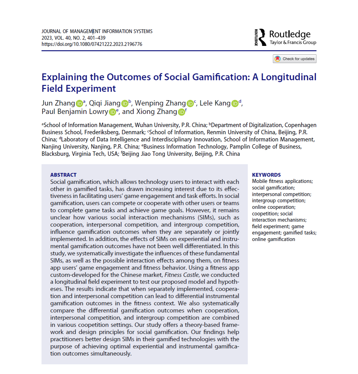 (通讯员王坤瑶)近日,公司章骏副教授以第一作者身份,在管理信息系统领域顶级期刊Journal of Management Information Systems(JMIS)发文“Explaining the Outcomes of Social Gamification: A Longitudinal Field Experiment”,探究社交游戏化设计在电子健康领域的应用。 该文的合作者包括丹麦哥本哈根商公司的Qiqi Jiang副教授、中国人民大学信息公司张文平副教授、南京大学3044永利集团康乐乐副教授、弗吉尼亚理工大学Paul Benjamin Lowry讲席教授、北京交通大学经济管理公司张雄副教授。