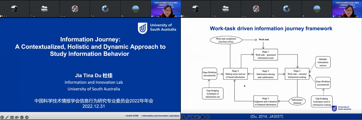 澳大利亚南澳大学STEM学部教授带头人、信息与创新实验室主任Jia Tina Du副教授作题为“Information Journey: A Contextualized,Holistic and Dynamic Approach to Study Information Behavior”的主旨报告。她系统介绍了信息旅程的概念和理论框架,指出其在信息行为研究中情境化、整体化和动态化的特点,认为信息干预应考虑并支持信息旅程的不同阶段。