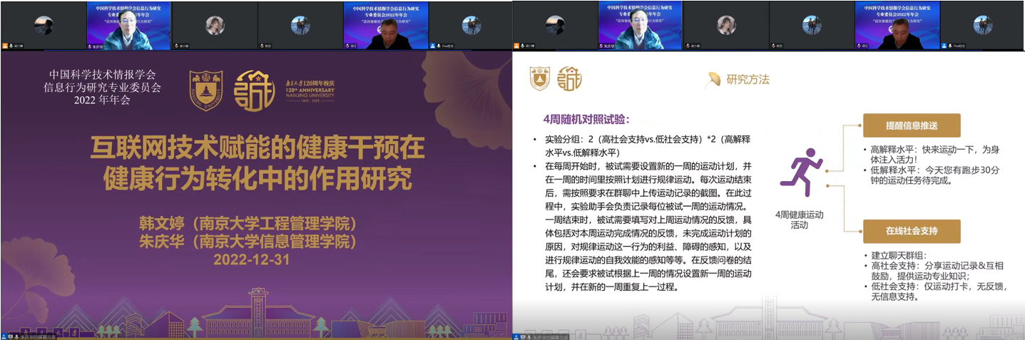 南京大学3044永利集团副经理朱庆华教授围绕“互联网技术赋能的健康干预在健康行为转化中的作用”主题作主旨报告。他指出,互联网技术赋能的方式对用户的健康信息行为起到了积极的干预作用。他通过长期的随机对照实验,分析了不同互联网技术赋能的干预方式在促进健康行为表现中的作用。他提出的相关理论模型与实证发现,对改进在线健康干预手段、提高在线健康干预效率具有积极的促进作用。