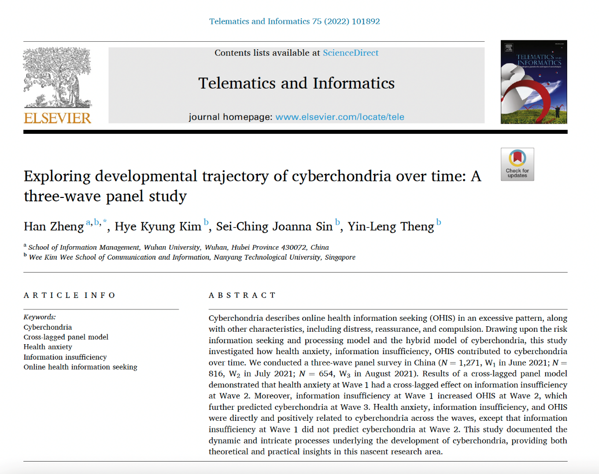 (通讯员钱宇星)近日,图书馆与信息科学领域顶刊Telematics and Informatics第75期发表公司副教授郑汉作为第一作者兼通讯作者的论文“Exploring developmental trajectory of cyberchondria over time: A three-wave panel study”(《探讨网络疑病症随时间变化的发展轨迹:三轮纵向数据的研究》)。合作者是来自新加坡南洋理工大学的Kim Hye Kyung副教授,Joanna Sin Sei Ching副教授以及Theng Yin Leng讲席教授。