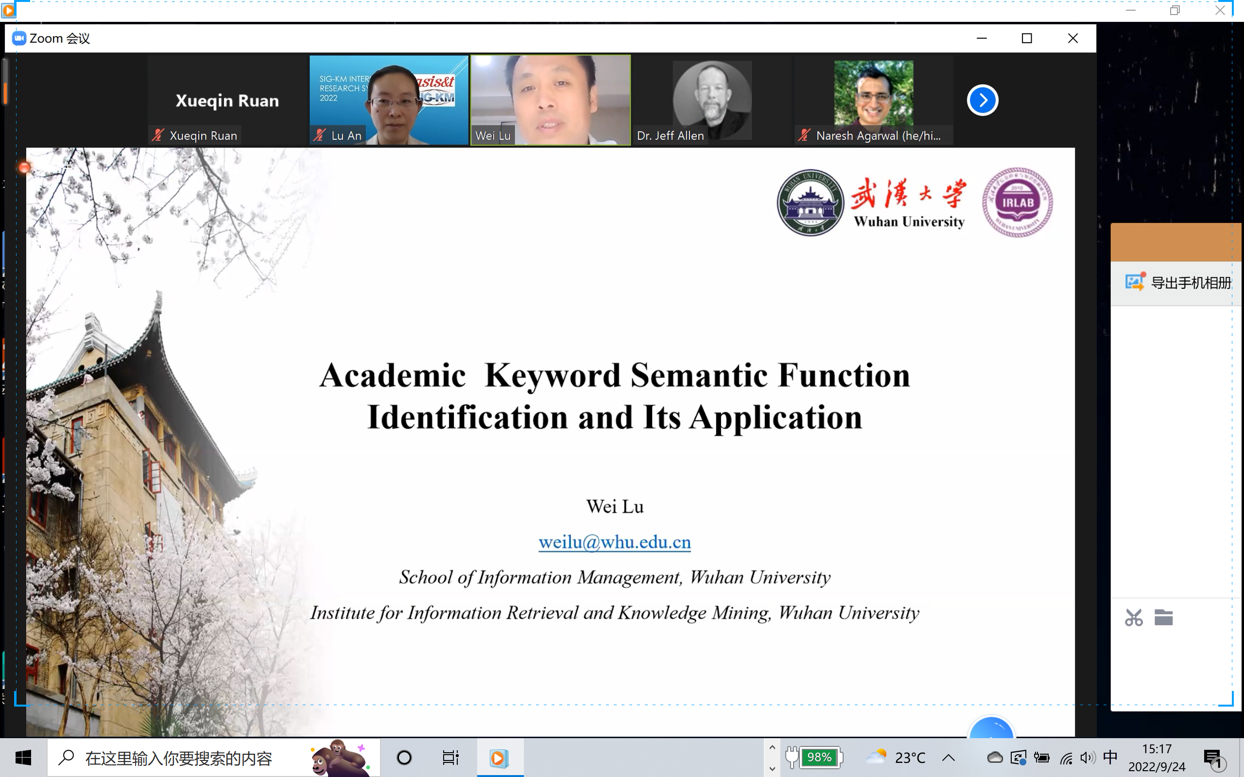 3044永利集团经理、信息资源研究中心研究员陆伟教授作题为“Academic Keyword Semantic Function Identification and Its Application”的主旨报告。他针对当前词汇功能识别研究依赖于人工构建的特征,并缺乏公开可用的数据集的局限性,结合基于多种不同策略的关键词功能识别模型的优缺点,提出同时在低资源和高资源情境中都具有良好表现的词汇功能识别模型MPT。该模型能应用于作者关键词选择行为、学术论文新颖性度量、机理抽取等研究。