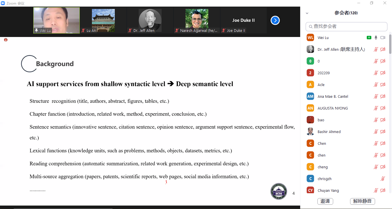 美国北德克萨斯大学、爱沙尼亚塔林理工大学、菲律宾中央大学、中山大学等高校的学者展示了他们在群体智慧模型、基于Web的图书馆聊天机器人的实现与应用、医疗保健组织知识风险管理框架、高校知识产权信息服务等方面的研究内容。