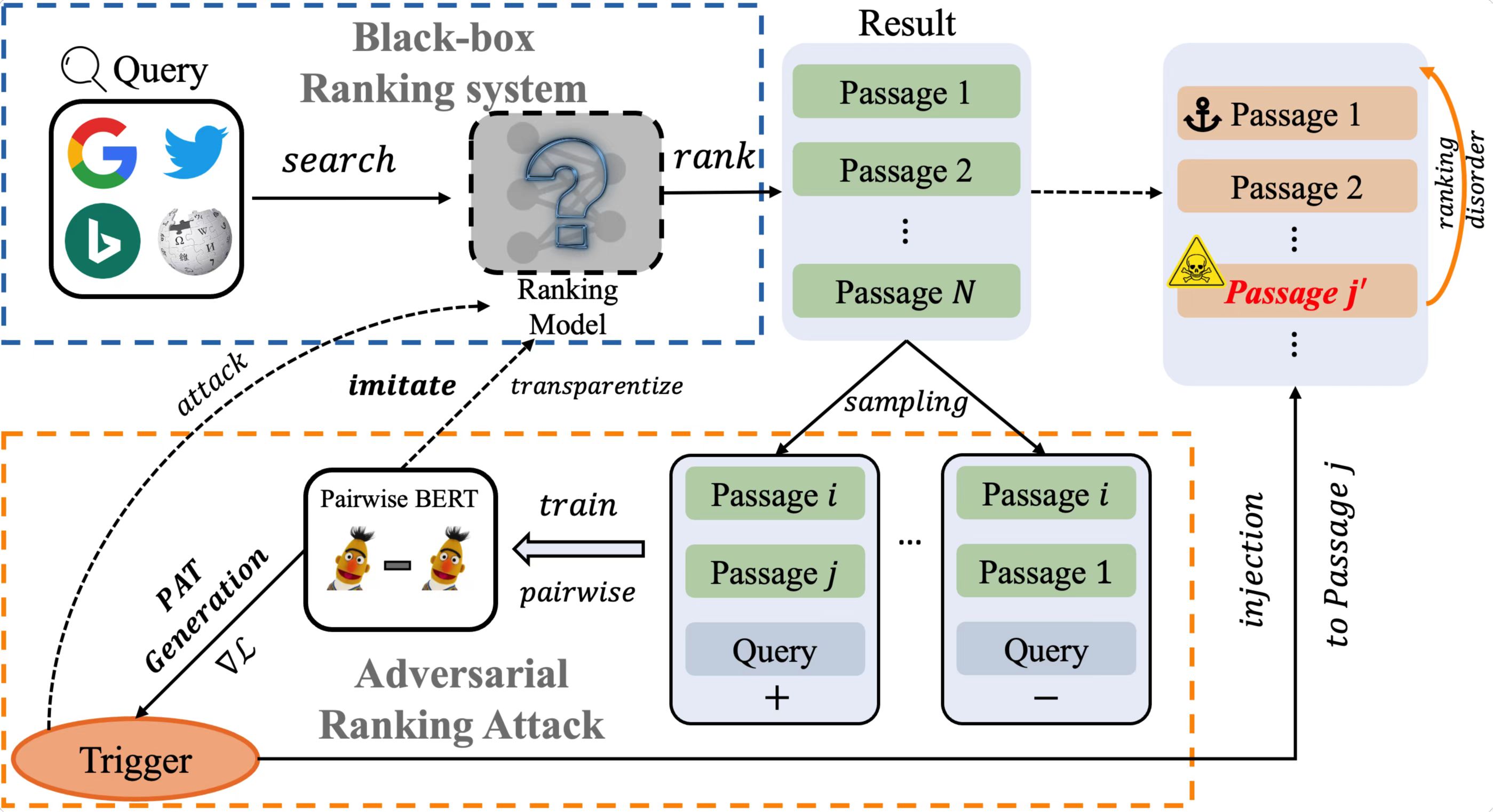 随着基于Transformer的BERT等预训练模型的提出和广泛应用,经过深度预训练和微调的Transformer在众多文本排序任务中取得了最优越的性能。然而,神经排序模型继承了神经网络的对抗性弱点,即一个小的故意的扰动(例如,图像上的一些像素变化、文本中几个字符的改变)可能会引发预测结果的极大变化,这种弱点可能被用作搜索引擎毒化、观点引导等。先前的对抗排序攻击主要集中在基于深度图像排序系统、文本分类和机器翻译系统上,而深度文本排序模型的漏洞尚未得到较多探索。此外,真实场景下的排序系统禁止任何形式的白盒访问,黑盒攻击更能揭示贴近实际的排序系统漏洞。