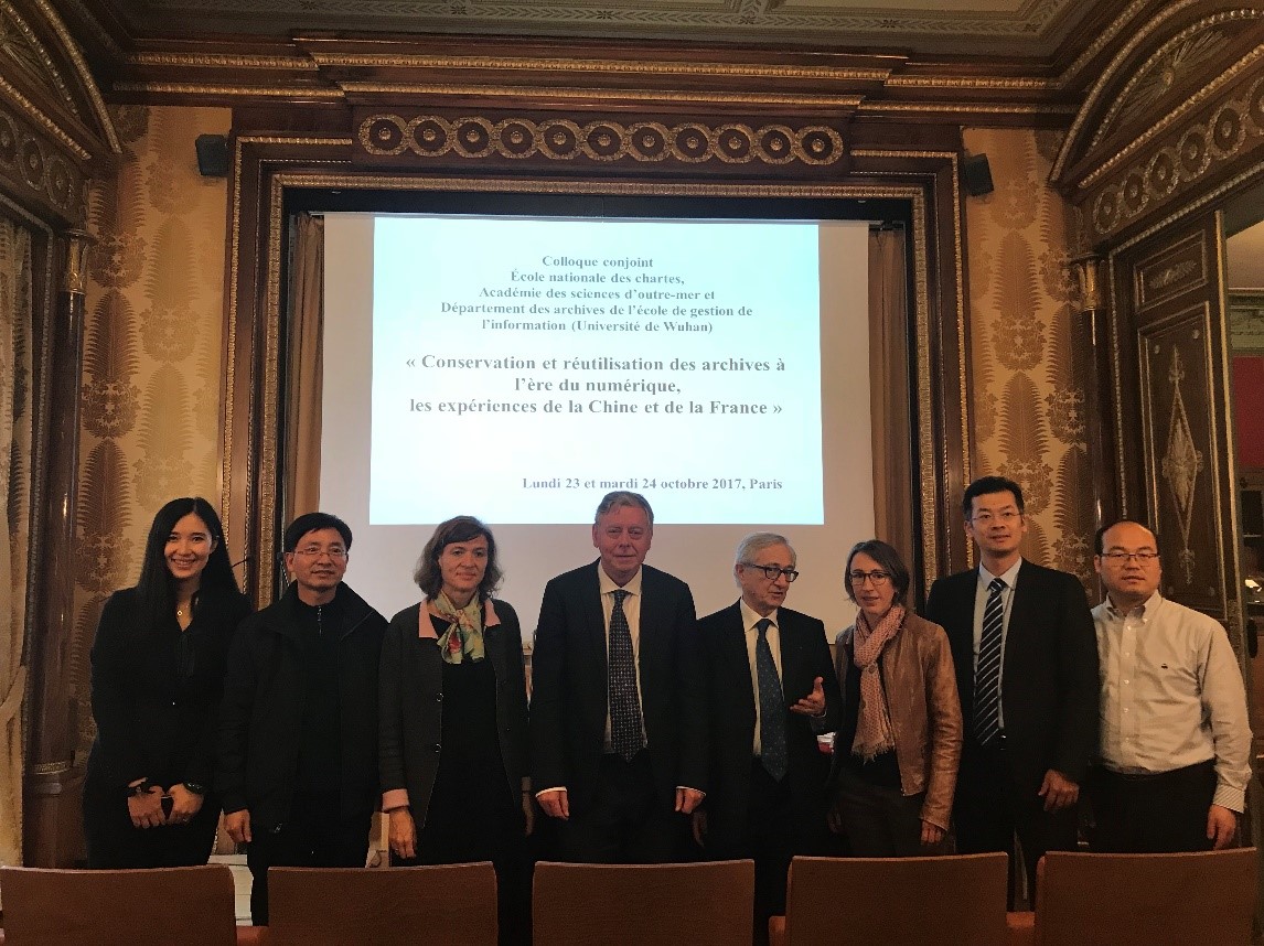 10月23至24日,在《3044永利集团与法国海外科学研究院关于“国际合作培育项目”的协议》框架下,《数字时代的档案保管和再利用—中法两国的实践》学术研讨会分别在法国档案公司(Ecole des Chartes)和法国海外研究院(Académie des sciences d’outre-mer)举行。法国档案公司董事长Michelle Bubenicek教授、公司副经理周耀林教授、法国海外科学研究院秘书长Pierre Gény分别致辞,会议由法国档案公司教授、法国海外科公司前任经理、法国骑士勋章获得者Bruno Delmas院士主持。研讨会上,中法档案专家围绕两国的档案保管和再利用、数字人文等领域展开了深入系统的研讨交流。法国档案跨部门服务中心的专家学者Christine Nougaret从中心职能、AD-ESSOR计划和数字存档系统等方面介绍了法国地方政府数字存档情况。法国国家档案馆科学支持部门主任Beatrice Herold强调了保护原生数字档案和历史上已经形成的数字化遗产的重要性,主张促进跨部门合作以更好地保护数字档案。法国学者Bertrand Caron阐述了数字时代如何收集和获取公共档案的国家性策略,提出要在法律法规中加强档案的作用、确保可持续收集档案和民众可以以新型方式查阅档案。此外,与会法国专家学者还从数字存储风险周期管理、旧报纸的数字化和再利用、当代法国档案通讯概况以及研究人员的协作对档案发展的贡献等方面做了详细报告。公司周耀林教授对我国档案局工作的“三个体系”的背景与内容进行了梳理和报告。此后,他专门报道了当前非物质文化遗产档案信息资源存储与组织现状、相关研究成果,并在此基础上,提出了基于本体的面向用户需求的多源异构非物质文化遗产档案信息资源语义检索模型及其实现路径。王晓光教授通过阐释数字人文研究的意义及核心价值,以敦煌壁画数字化为例构建敦煌壁画图像高层本体模型和信息层次模型以及图像标引信息的结构化组织模型并对其模型进行了有效的实验验证。王平副教授对比了现有电子档案元数据封装的主流标准,在总结其不足之处的基础上提出了基于数字取证技术的电子档案元数据封装模型,并以浙江档案网历史图库档案为例验证了模型的有效性。王玉珏博士通过对比分析我国档案法修订前后的变化,分析了我国档案法的内容与特点。