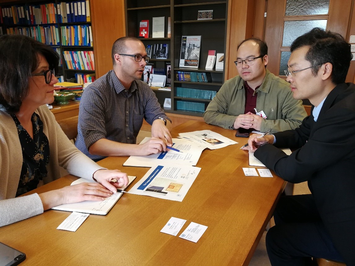 2017年10月25日,在法国专题研讨会结束后,周耀林教授等人受邀前往联合国驻日内瓦档案办事处进行参观和交流。在此期间,周教授与该处负责人Blandine BLUKACZ-LOUISFERT女士就国际合作交流项目选派优秀教师、员工前往联合国驻日内瓦图书馆档案办事处等国际组织进行访问和实习,最终达成初步意向,并计划2018年系统深入展开双方的合作。