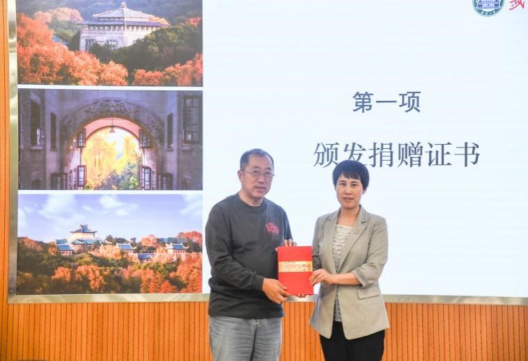崔琼向张克科颁发捐赠证书。陈传夫、付兴荣向到场同学介绍分享嘉宾的相关情况。在分享环节中,张克科以“热土在呼唤:深港河套发展的新机遇”为主题,详细地介绍了个人撰写新书《深港科技创新口述史》的内容和背后的故事,展现了改革开放以来深圳与香港的巨变。他对同学们寄予厚望,鼓励同学们抓住国家发展机会,创造美好未来。何五元分享了《珞珈赋》和“永是珞珈一少年”的创作故事,讲述了一句话、一辈子、一生情的武大情结。两位员工饱含深情,将书法作品《珞珈赋》和《永是珞珈一少年》赠送公司。