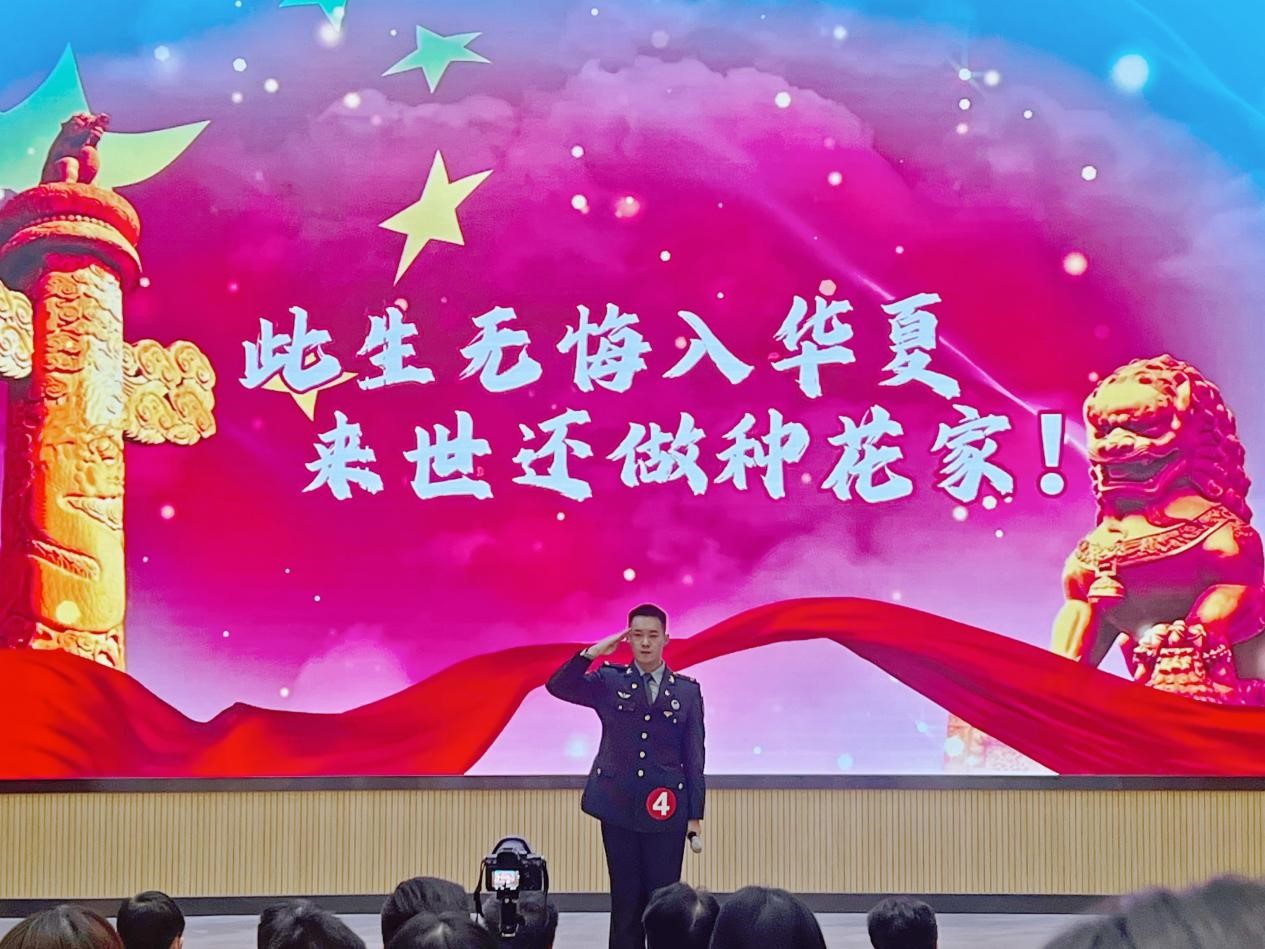 “张帅,到!”随着一声响亮的应答,张帅同学身着军装跑步来到台前向观众敬出军礼。他结合入伍经历,深情讲述了从老员工到士兵的青春奋斗故事。