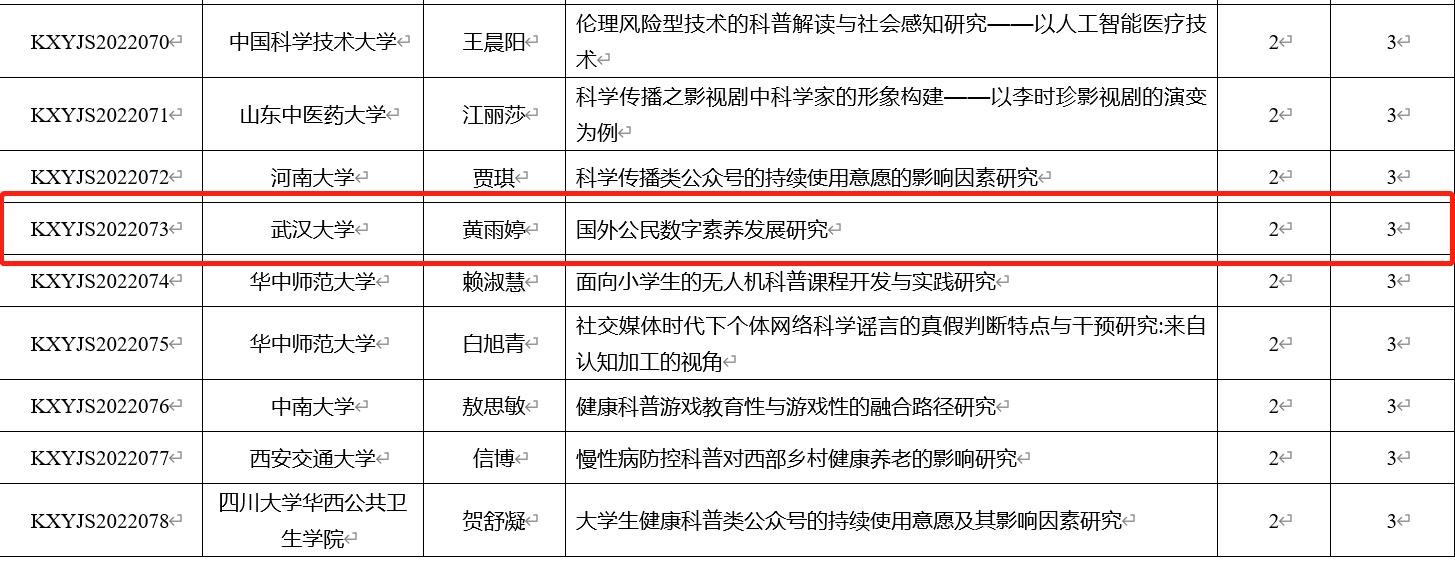 (通讯员吴庆梅)日前,中国科学技术协会发布了2022年度研究生科普能力提升项目评审结果,公司获批2项,公司2020级博士研究生黄雨婷同学申报的项目《国外公民数字素养发展研究》获批“科普理论与实践研究类”项目(项目编号:KXYJS2022073),公司2021级博士研究生郑翔同学申报的项目《基于书目提要的中国古代农业科技文献数据挖掘与知识图谱呈现》获批“科研成果科普转化类”项目(项目编号:KXYJS2022084)。这也是公司第2次获该项目立项。