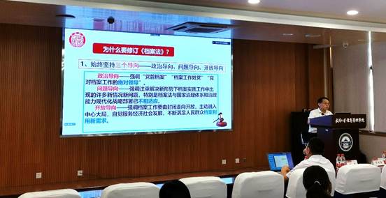 针对新修订出台的《档案法》,湖北省档案馆李宗春研究馆员提出了自己的思考。他提出,要充分认识档案法修订的意义、理解修订的主要内容、把握修订的精神实质。结合工作实践,他还简要分析了几起档案违法案例,使学员们将视角转向档案实际工作,为档案学研究的落实落地提供了宝贵经验。