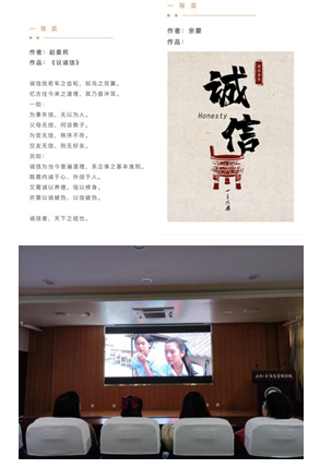 为将诚信意识切实内化为自身修养,公司还举办了诚信观影、诚信作品征集等多元化特色活动。12月11日-18日,举办第一届“我诚创我信”诚信创意作品征集活动,评选出语言文字类、平面设计类作品一、二、三等奖及优秀奖;12月24日,“学术有道,诚信立研”学术诚信观影活动顺利举行,同学们在观看诚信道德主题电影《天才枪手》中加深了对“诚信”一词的认识,领悟到“诚信是学术的生命线”这一道理。