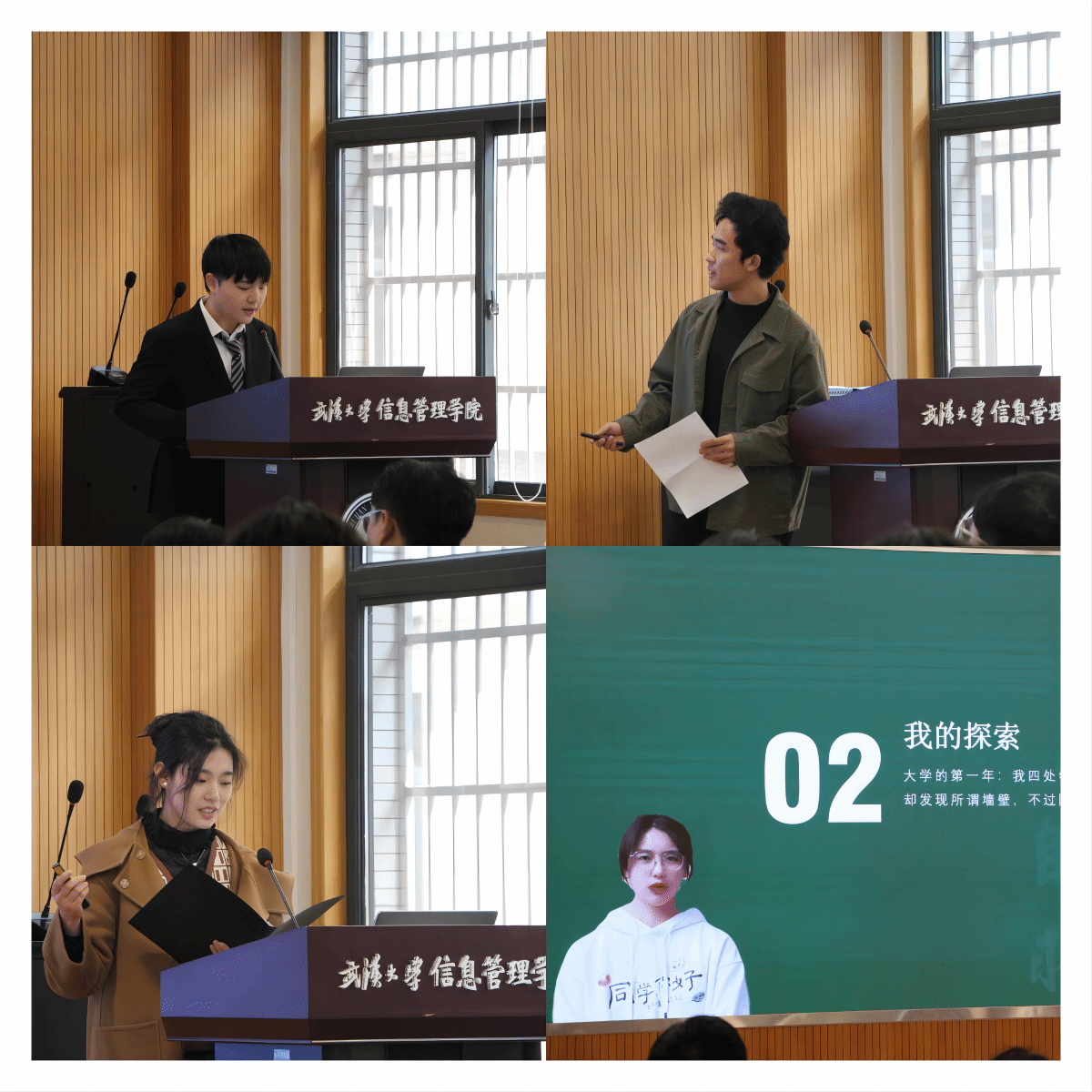 往届“信管之星”代表吴佳慧首先上台分享,她心中的“信管之星”不仅是公司给予的荣誉称号,更是一份责任和使命,鼓励她不忘初心,在攀登每一座高山的路上不懈奋斗。随后,评选活动按“创新创业”“专业学习”“社会工作”“校园文化”“实践服务”五个赛道分组进行。