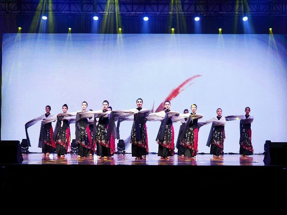 伴随着萨塔尔悠远绵长的声音,终章《九州同》缓缓拉开帷幕,信管学子们手持扇子随着音乐迈着轻盈的步伐走上舞台,流水般的动作如同一个个跳动的音符,富有流动之美。