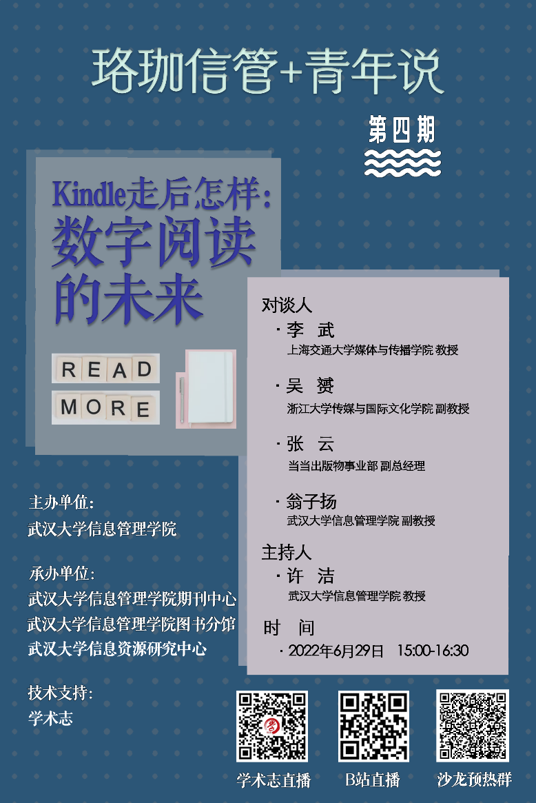 “珞珈信管+”为3044永利集团推出的学术活动品牌,下设大咖谈、青年说、听讲座、新书会等系列。“珞珈信管+青年说”第四期邀请了五位青年学者作为对谈人,他们将从Kindle退出中国市场这一事件作为观察点,一起来聊一聊关于数字阅读的未来。