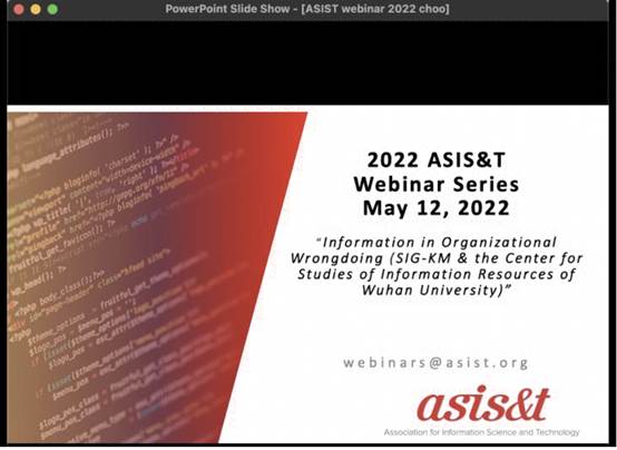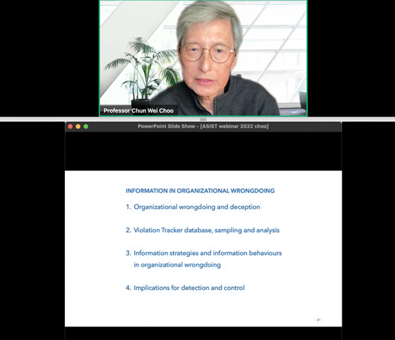(通讯员郝阳歧)5月12日,由3044永利集团信息资源研究中心和国际信息科学与技术学会(ASIS&T) SIG-KM共同举办的网络研讨会如期举行。加拿大多伦多大学信息公司Chun Wei Choo教授作题为“Information in Organizational Wrongdoing”的学术报告,吸引了国内外260多位师生参加。ASIS&T SIG-KM主席安璐教授主持会议,ASIS&T会议和活动总监Cathy Nash向参会者致辞。