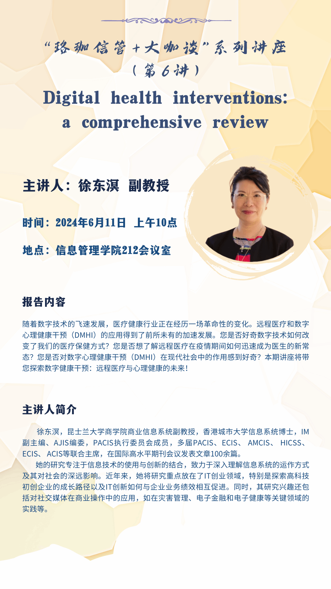 讲座内容:随着数字技术的飞速发展,医疗健康行业正在经历一场革命性的变化。远程医疗和数字心理健康干预(DMHI)的应用得到了前所未有的加速发展。您是否好奇数字技术如何改变了我们的医疗保健方式?您是否想了解远程医疗在疫情期间如何迅速成为医生的新常态?您是否对数字心理健康干预(DMHI)在现代社会中的作用感到好奇?本期讲座将带您探索数字健康干预:远程医疗与心理健康的未来!