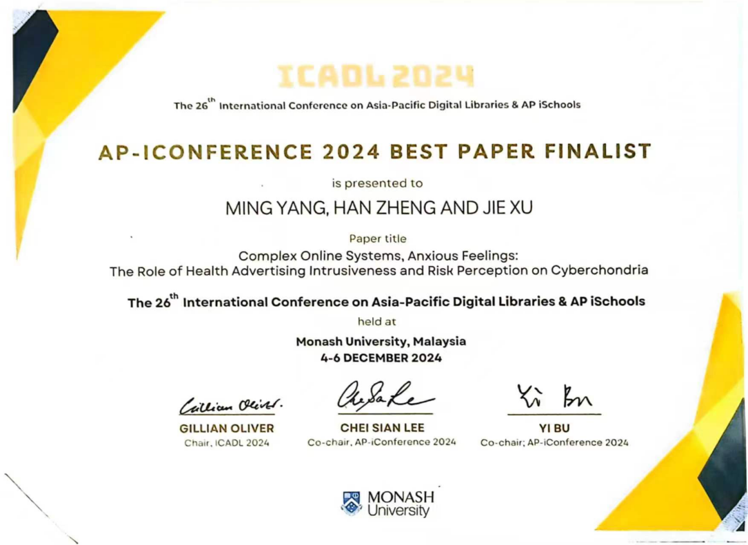 在颁奖仪式上,由郑汉、许洁指导,出版科学系2023级硕士研究生杨明撰写的论文“Complex online systems, anxious feelings: The role of health advertising intrusiveness and risk perception on cyberchondria”入围最佳论文奖(The Finalist of the Best Paper Award),获得第二名,体现了公司在数字图书馆和信息行为学领域的学术影响力与研究实力。