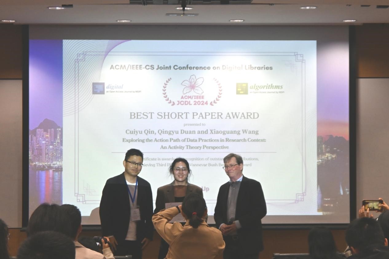 (通讯员段青玉)12月16日至20日,第31届美国计算机协会(ACM)/电气与电子工程师学会(IEEE)数字图书馆联合会议(Joint Conference on Digital Libraries,JCDL)在中国香港举办。公司王晓光教授指导的出版发行学2023级博士生秦翠玉作为第一作者、公司博士后段青玉作为合作者的论文“Exploring the Action Path of Data Practices in Research Context: An Activity Theory Perspective”获年会“最佳短文奖(Best Short Paper Award)”。