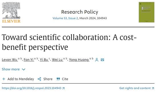 (通讯员伊凡)近日,陆伟教授课题组在国际顶级期刊Research Policy发表了题为“Toward scientific collaboration: A cost-benefit perspective”的论文。公司博士生吴乐艳为第一作者,指导教师为公司陆伟教授、黄永副教授(通讯作者),公司博士生伊凡、北京大学助理教授步一参与论文相关工作。