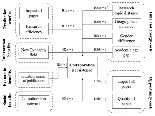 该研究采用社会交换理论来研究科研工作者先前的合作经验与其后续合作行为之间的关系,并结合成本-收益理论,将影响持续性合作的因素分解为成本和收益两个主要维度,构建了一个综合的持续性合作行为成本—收益框架。其中,收益因素包括生产、经济、信息和社会因素,而成本因素则包括时间精力成本和机会成本。