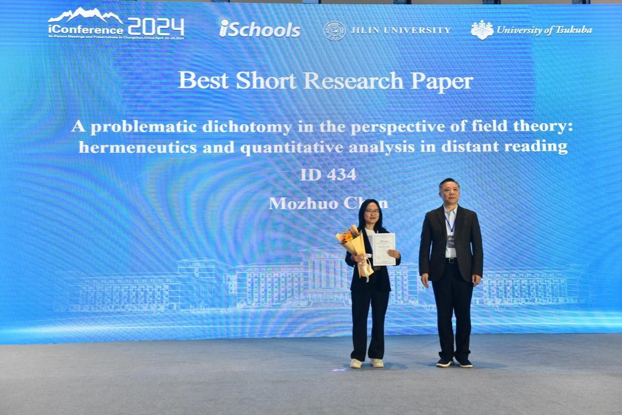 本届会议共录用公司师生为第一作者的中英文长论文(Full Research Papers)8篇、英文短论文(Short Research Papers)5篇、英文海报(Poster)4篇、中文论文6篇、中文海报3篇。副经理王晓光教授主持中文主旨报告,副经理周力虹教授作为iSchools联盟三人核心小组成员(Treasurer)主持开幕式主旨报告,安璐教授参加中文论坛担任点评嘉宾,毛进副教授等撰写的中文论文《基于弱信号三维框架的新兴主题早期识别方法研究》获评最佳中文论文。