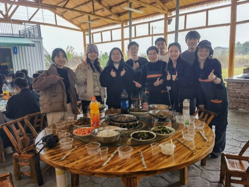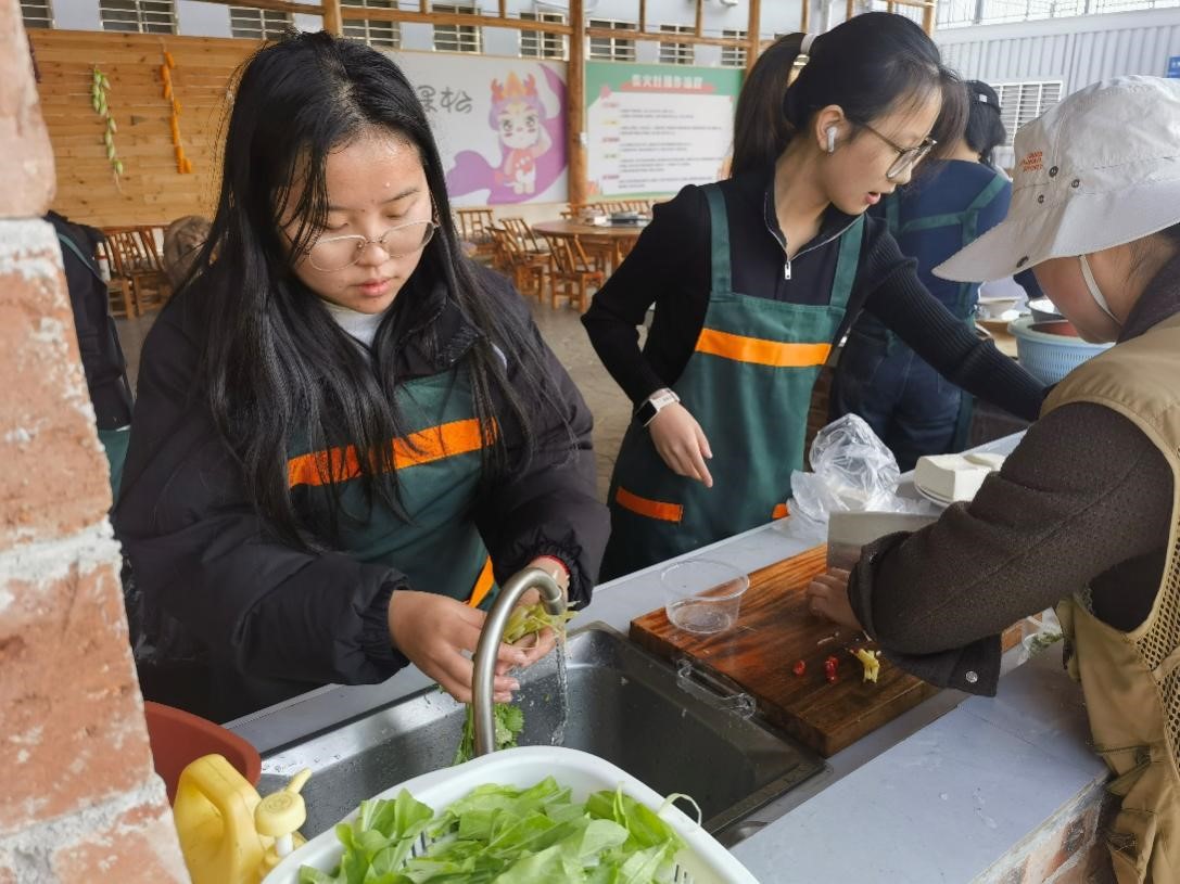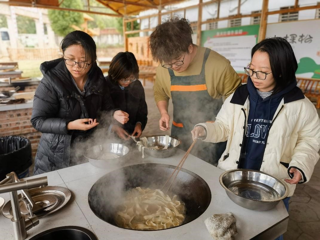 下山回到营地后,员工们纷纷撸起了袖子,准备动手体验柴火灶做饭的自然野趣。他们分工井然,洗菜、切菜、炒菜……虽然不少同学仍稍显生疏、手忙脚乱,但经过经验丰富的九棵松村厨娘们的耐心指导,大家都渐入佳境,不久营地里便飘出了浓郁的香味。经过一番忙碌后,一盘盘色香味俱全的菜肴终于端上了餐桌。大家围坐在一起品尝着自己亲手制作的柴火饭,感受劳动果实的甜美。