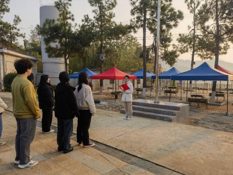 次日清晨,随着第一缕阳光的升起,营地举行了庄严的升国旗仪式。同学们肃立注目,回顾历史,重温记忆,心中充满了对祖国的热爱和对未来的憧憬。图书馆学本科生党支部书记邱雅琪就乡村振兴这一主题进行国旗下的讲话,回顾了乡村振兴战略的重要意义和发展历程,表达了对未来乡村振兴工作的期望和美好愿景。随着讲话的进行,同学们的目光也更加坚定,希望能共同为构建美丽宜居的乡村贡献智慧和力量。