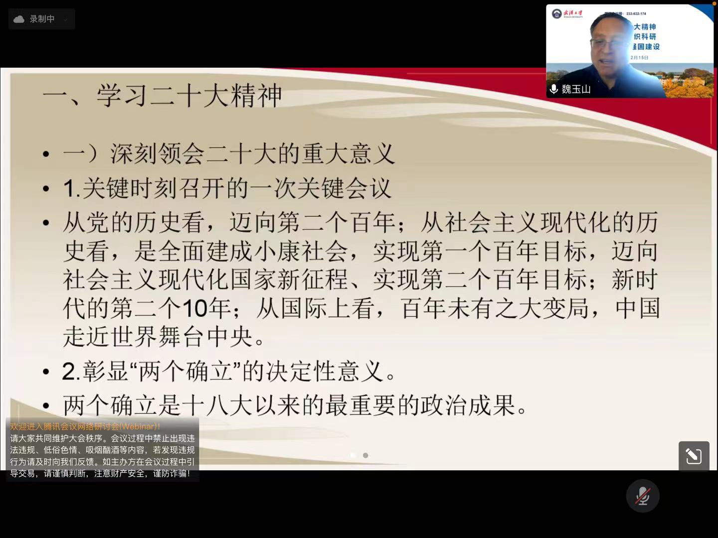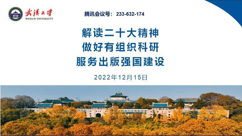 12月15日,第一场专题报告会在线上举行。中国新闻出版研究院经理、党委副书记魏玉山同志作《学习二十大精神,加速出版强国建设》专题报告。出版科学系教师党支部全体成员参加,出版科学系教授方卿同志主持报告会。