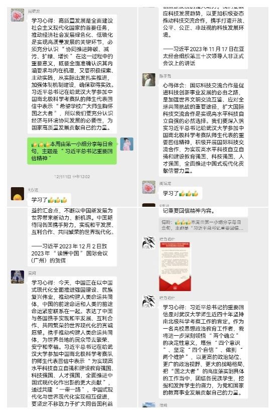本次专题“每日金句”学习由第一党小组负责。党员们通过学习习近平总书记重要回信全文及相关报道,结合自己的本职工作和学习体会从经济与环境协同发展、全球和平发展、科技创新、国家安全发展、思想引导和价值引领等方面进行了领学和分享。