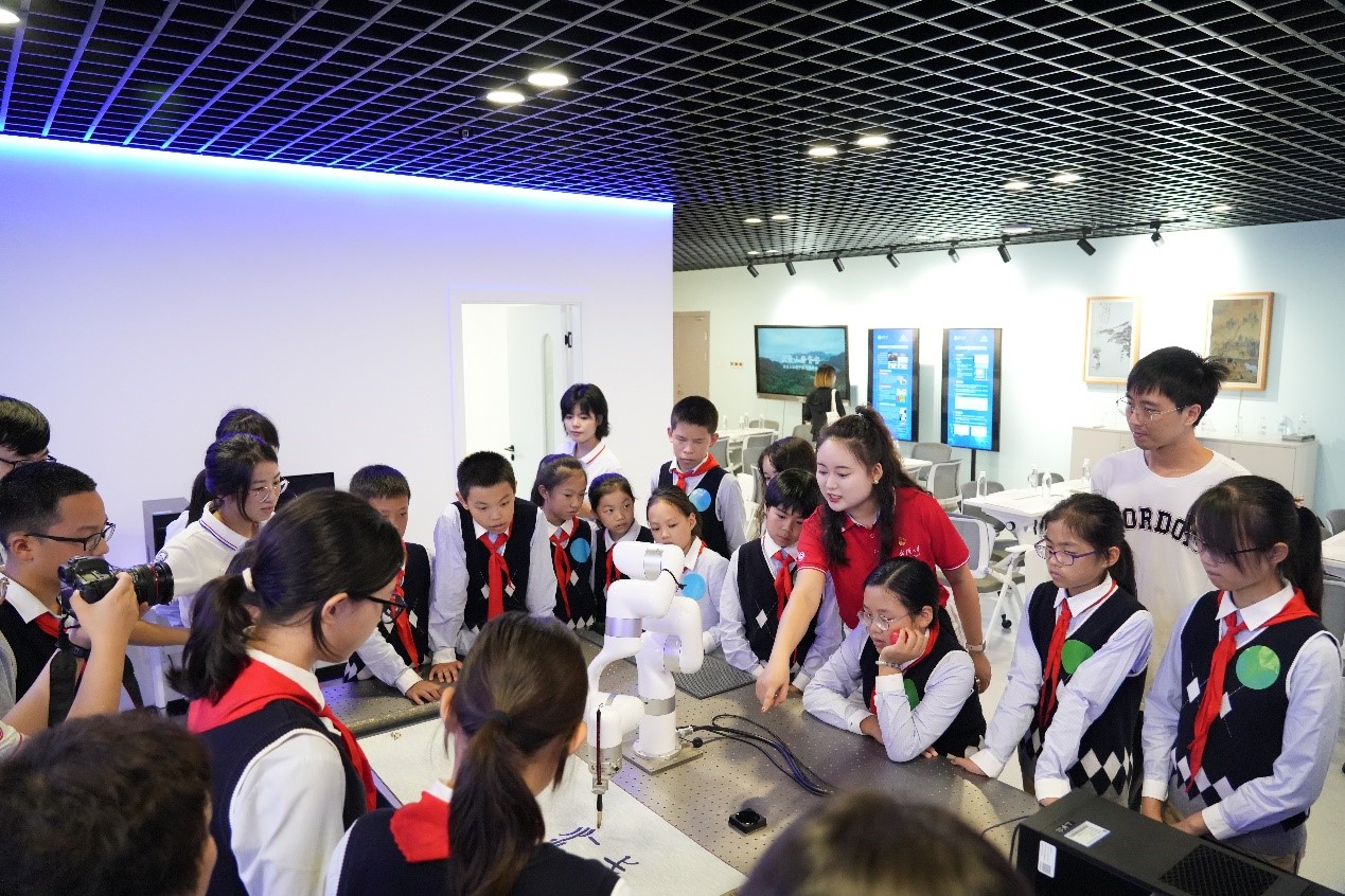 在沉浸投影的奇幻世界里,箭扣长城的高精度模型仿佛诉说着过往的故事,孩子们在实验室讲解员、支部党员周子琦的带领下,亲眼见证了数字技术如何为文物披上保护的铠甲。而敦煌莫高窟第159窟的VR体验、文物数字建模、机械臂篆书书写、动作捕捉仪……这一切,都让孩子们仿佛置身科幻世界,亲身体验了文化遗产的“数智活化”。