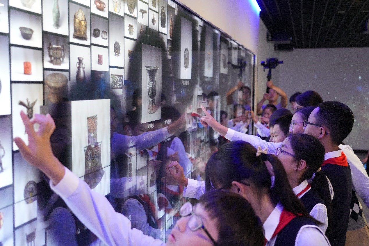 “小朋友们有没有参观过博物馆?”“有没有去过故宫?”活动伊始,王玉珏和小员工轻松愉快的互动问答,瞬间点燃了孩子们对文化遗产的好奇心。在“云游故宫”的过程中,随着全景故宫、V故宫的数字展示,孩子们眼中闪烁着好奇的光芒,在一声声惊叹中感受到了数字技术的魅力。紧接着,王玉珏带领大家来到“海外博物馆里的中国”项目展区,屏幕上的文物通过数字技术“活”了过来,如同一扇窗让孩子们触摸到了流失海外文物的温度,每一次点击,都是对家国情怀的一次深情呼唤,文化认同在心中悄然生根。