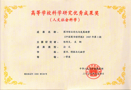 他在团队建设上科学谋划、全身投入,带领师生在图书情报与档案管理一级学科国家重点团队建设、提升国际合作水平等方面取得突出成绩。他积极推动本学科领域发展合作,促进两岸学术交流与学科共识,推动建立图书情报专业学位制度,促进全国学科协调发展。他与国际组织和同行建立了良好的学术关系,先后应邀到美国、法国、英国和新加坡等地进行学术交流。他尊重人才培养规律,凝炼出以问题为中心、面向任务的嵌入式教学方法,推进教学改革,探索出“三融合”教学模式,获省级教学成果一等奖,所授课程获批国家级精品资源共享课。指导的多名博士生获省优秀博士学位论文奖、全国优博论文提名奖和国家社科基金优秀博士论文资助项目。指导的多名研究生在国内外重要工作岗位上发挥作用。