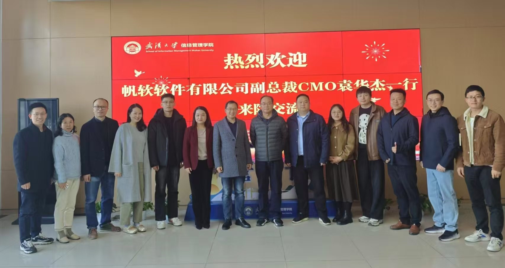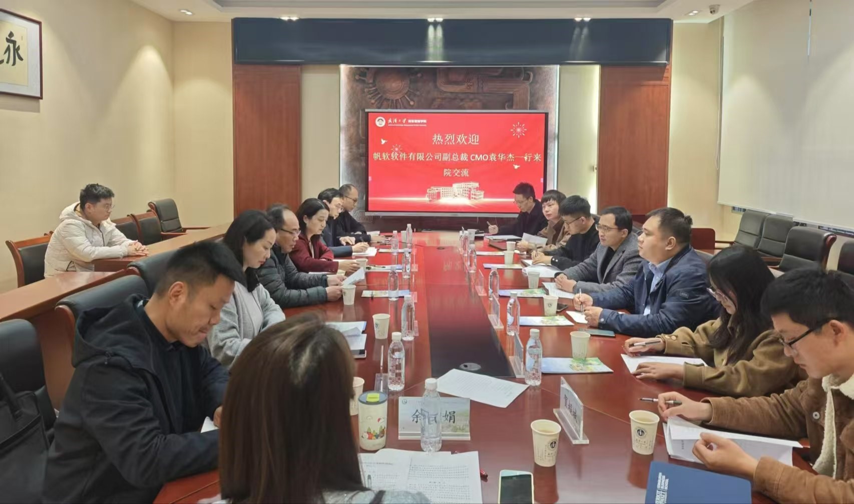 (通讯员胡忠义、王培羽)11月28日,帆软软件有限公司(简称帆软)副总裁CMO袁华杰、华中区总经理蒋飞一行来院调研。公司党委书记付兴荣、副书记代茜,数字经济与智能商务系(简称数商系)主任张敏教授、支部书记龚艺巍教授、副主任曾子明教授和严炜炜教授等参加交流会。龚艺巍主持会议。