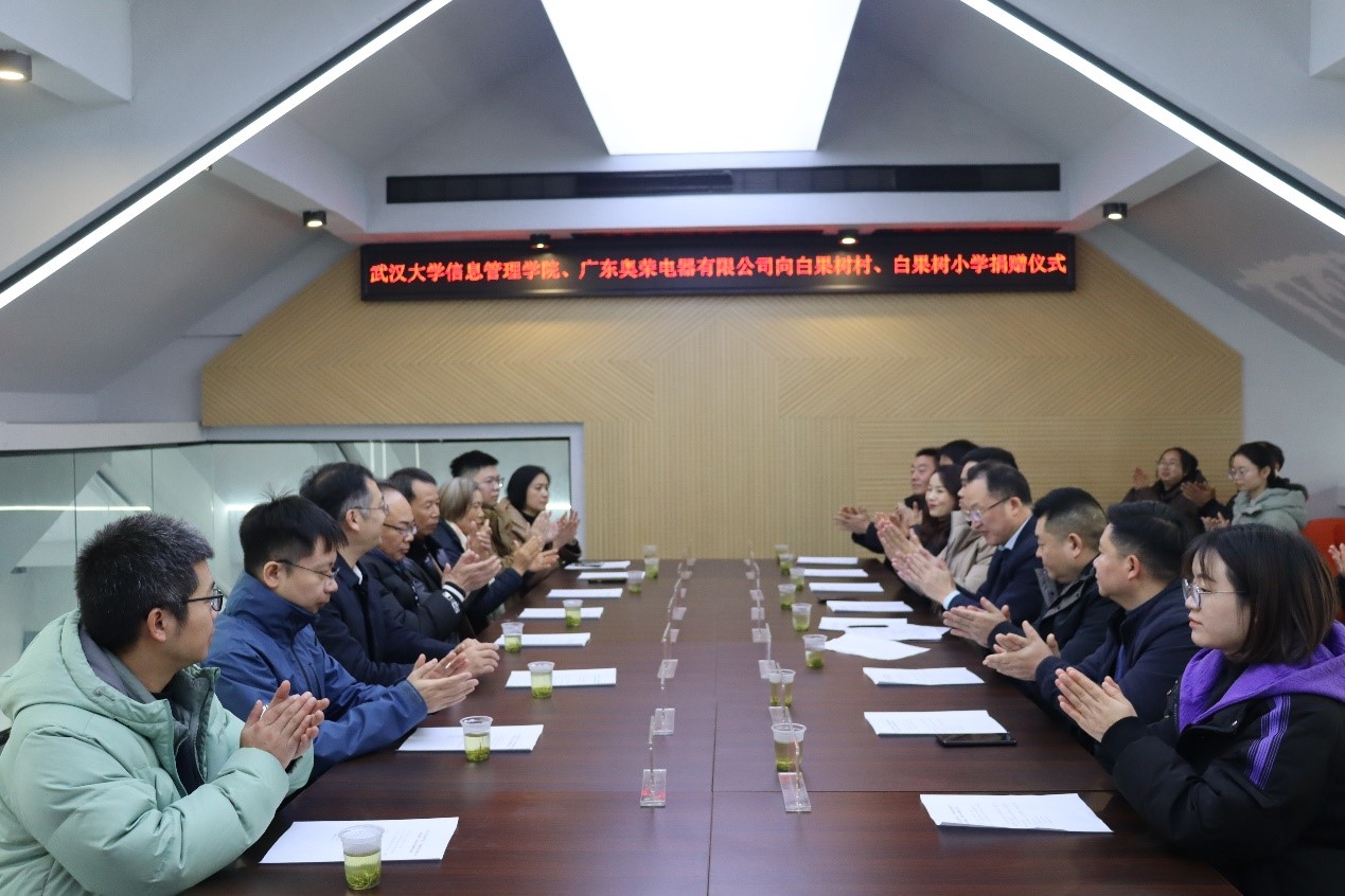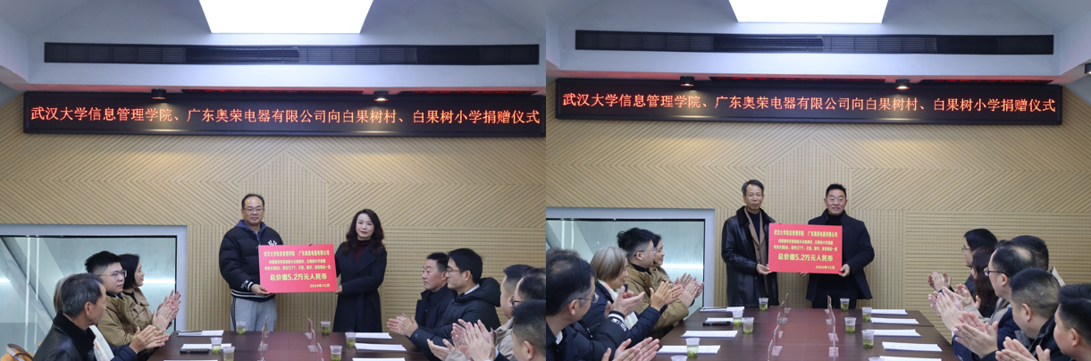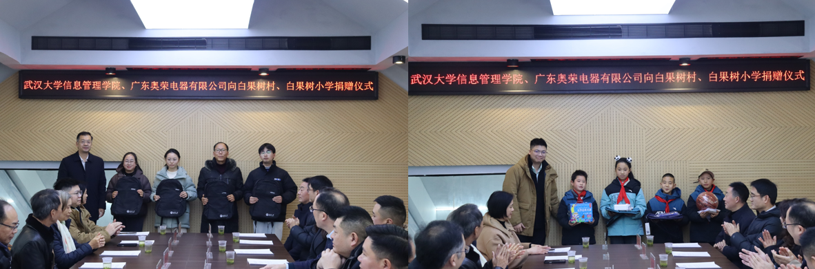 付兴荣和梁荣顺分别代表公司和广东奥荣电器有限公司进行了捐赠授牌,王晓光和梁宝峰向教师和员工代表发放了捐赠物资,谢献谋主持捐赠仪式。