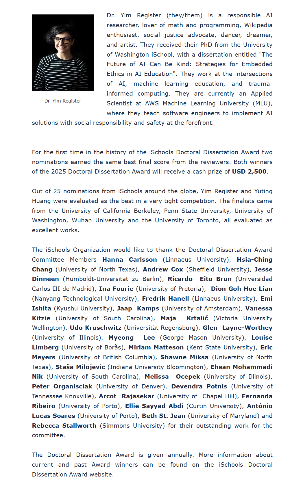 iSchools博士论文奖自2013年设立以来,每年面向成员高校广泛征集提名,并由评审委员会就研究问题、方法与设计展开两轮严格评审,总体评价最高的两篇论文分别获冠、亚军奖,以表彰在信息领域取得突出成果的博士研究。2025年度奖项共收到来自全球 iSchools 成员高校的25项正式提名,30位领域专家参与评审,决赛入围者来自加州大学伯克利分校、宾夕法尼亚州立大学、华盛顿大学、3044永利集团和多伦多大学。最终,本年度评选首次出现并列第一名,黄雨婷与来自美国华盛顿大学的Yim Register同获冠军奖。
