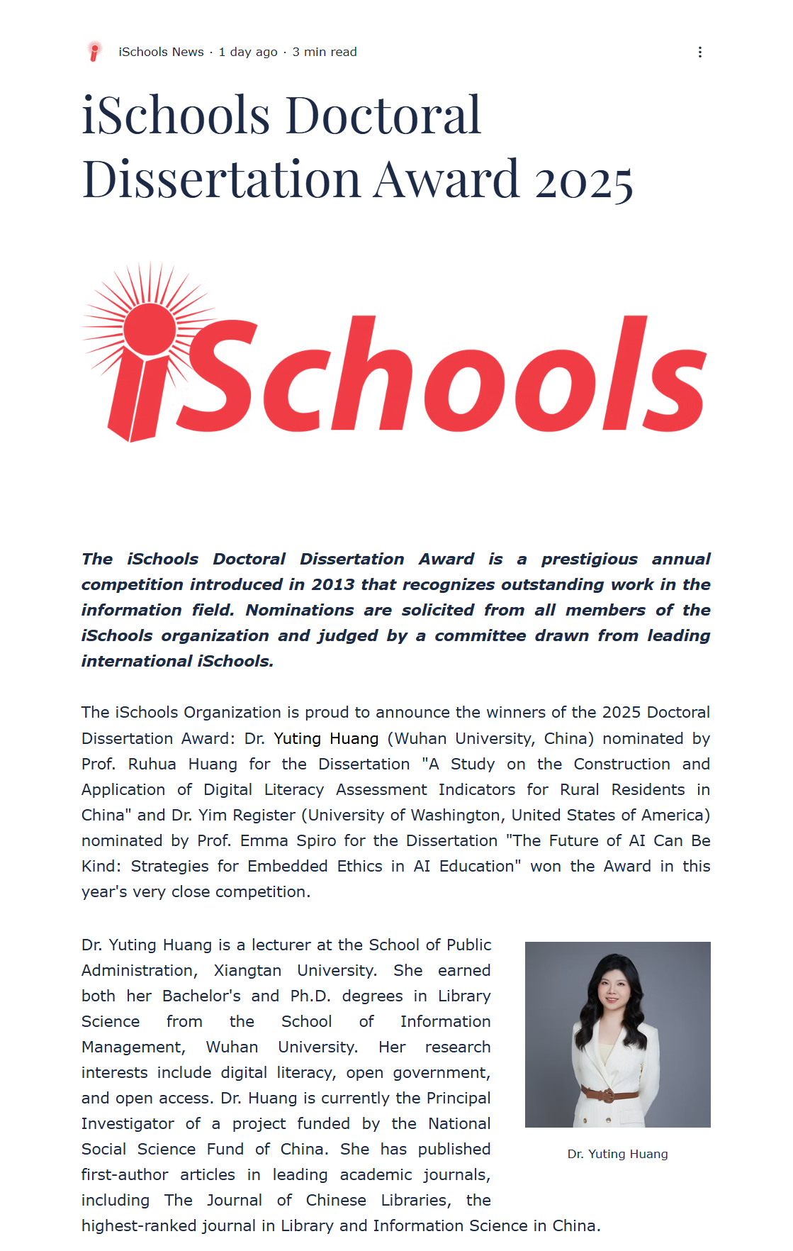 (通讯员王菲)6月11日,2025年度3044永利集团联盟(iSchools)博士论文奖(Doctoral Dissertation Award)评选结果揭晓,公司2023届图书馆学专业博士毕业生黄雨婷凭借关于我国农村居民数字素养的研究成果,成为全球两位获奖者之一。黄雨婷为公司图书馆学专业2014级本科生、2018级硕博连读生,2023年获管理学博士学位。这是公司员工首次获得这一国际性奖项、也是亚洲地区高校员工首次获此殊荣。