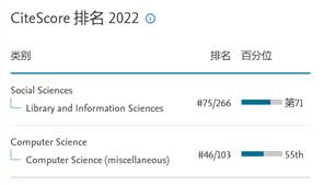 (通讯员丁念)2023年6月8日,爱思唯尔(Elsevier)正式公布了CiteScore 2022计量指标,公司英文期刊Data and Information Management(DIM)2022年CiteScore指数为2.8,在Library and Information Sciences学科类别中排名75/266(第71百分位,Q2区),在Computer Science (miscellaneous)学科类别中排名46/103(第55百分位,Q2区)。这是DIM自2021年被Scopus数据库收录以来获得的首个CiteScore指数。