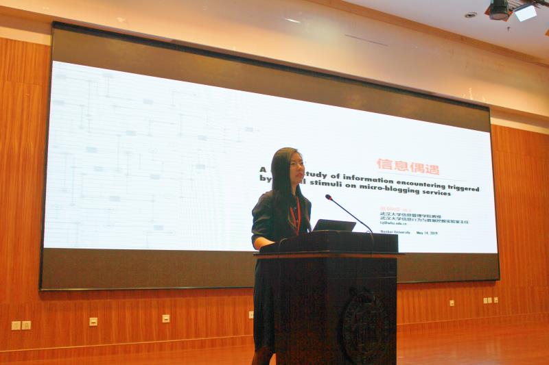 姜婷婷教授的报告主题为“视觉刺激物触发的信息偶遇行为研究”。她首先对信息搜寻、信息偶遇、信息规避等相关概念进行了解析,并介绍了与这几个概念相关的学术用语、它们各自的特征以及国际学术界目前与这一主题相关的主流研究等。随后她就环境中的刺激物对偶遇行为的触发机制展开了探讨。她表示可以通过基于关键事件技术的日记法,抽取信息偶遇事件中参与者的特征、相关视觉刺激物的特征以及整个交互过程等内容,从而揭示刺激物特征与交互行为之间的关系。这一研究有助于进一步理解信息偶遇行为,改进信息偶遇研究方法,为各类社交媒体吸引用户、增强与用户的互动等提供有价值的启示。