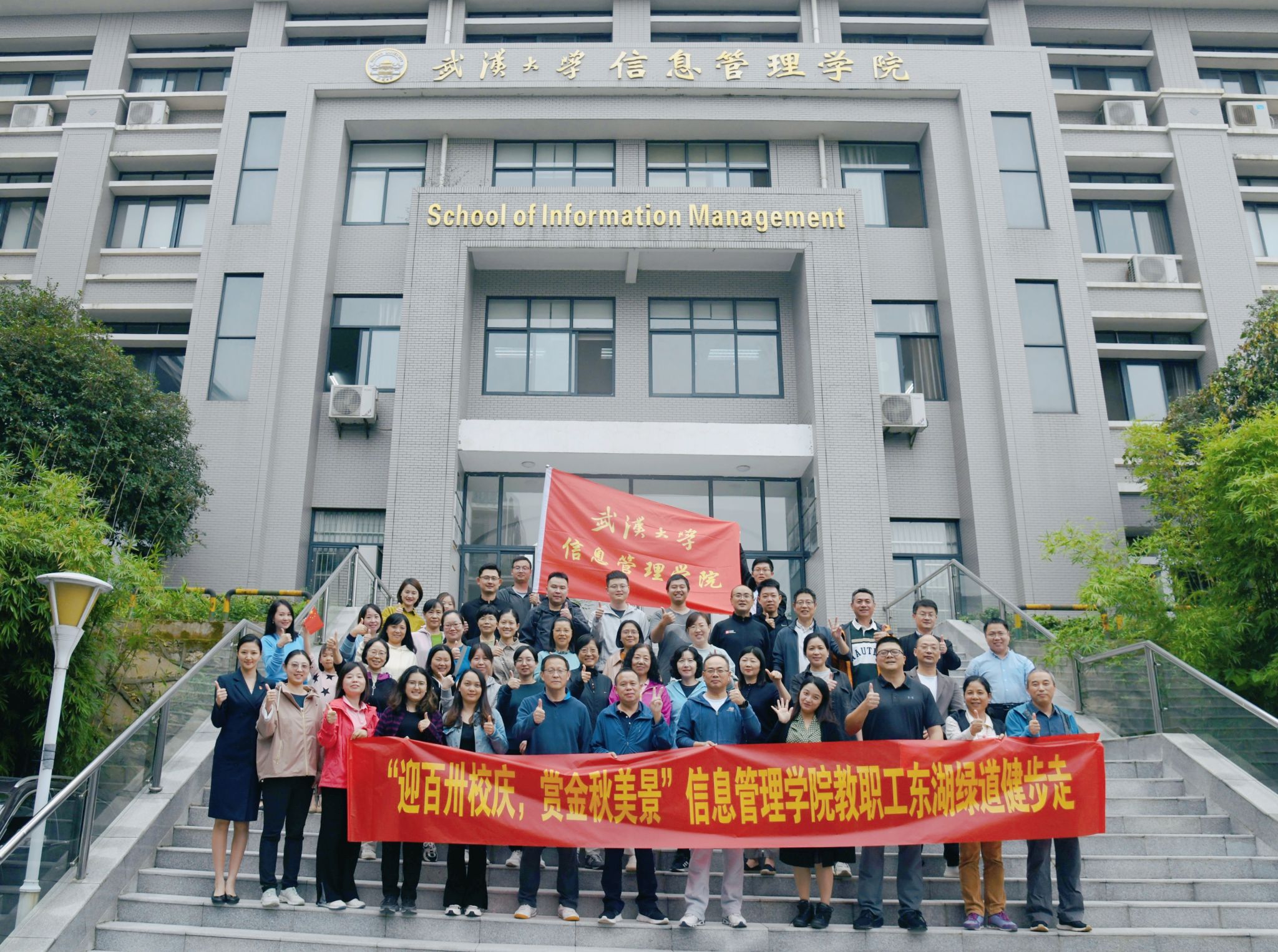 (通讯员陈孝禹)“快,一起来合个影”,老师们互相招呼,兴致勃勃地朝飘扬的院旗方向走去。随着相机的喀嚓声,大家在东湖梅园门前留下一张张开心合影照。为迎接百卅校庆和校第十三届教职工运动会,进一步提升教职工强身健体的意识,增进教职工交流,10月12日下午,院工会举办了“迎百卅校庆 赏金秋美景”东湖绿道健步走活动,吸引了众多教职员工报名参与。