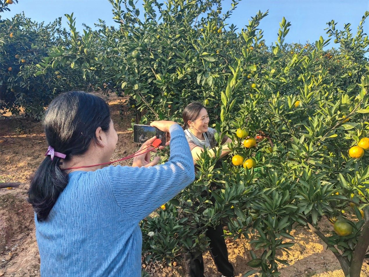 返程之前,老师们来到村中生态园,进行桔子采摘活动。金黄的桔子挂满枝头,桔园里洋溢着劳动的快乐与丰收的喜悦。老师们拎着篮子,随着剪刀的“咔嚓”声,一个个桔子落入嘴中,进入篮里,也留下了一张张秋日采摘的盛景“大片”。